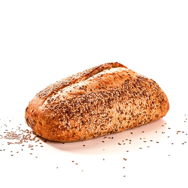 Ingredientes: Farinha de trigo branca*, água, fermento natural*, gergelim, linhaça marrom e sal.