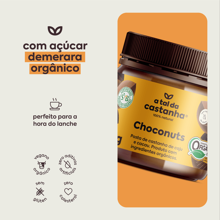 A Pasta de Castanha Choconuts Orgânica é a combinação perfeita de sabor e saúde. Com cacau e açúcar demerara orgânico, ela oferece um toque especial que a torna irresistível. Fonte de proteínas de alta qualidade e gorduras “do bem”, é ideal para consumir pura ou acompanhar pães, torradas, frutas e outros preparos. Saudável, prática e deliciosa, é uma escolha equilibrada para o dia a dia.